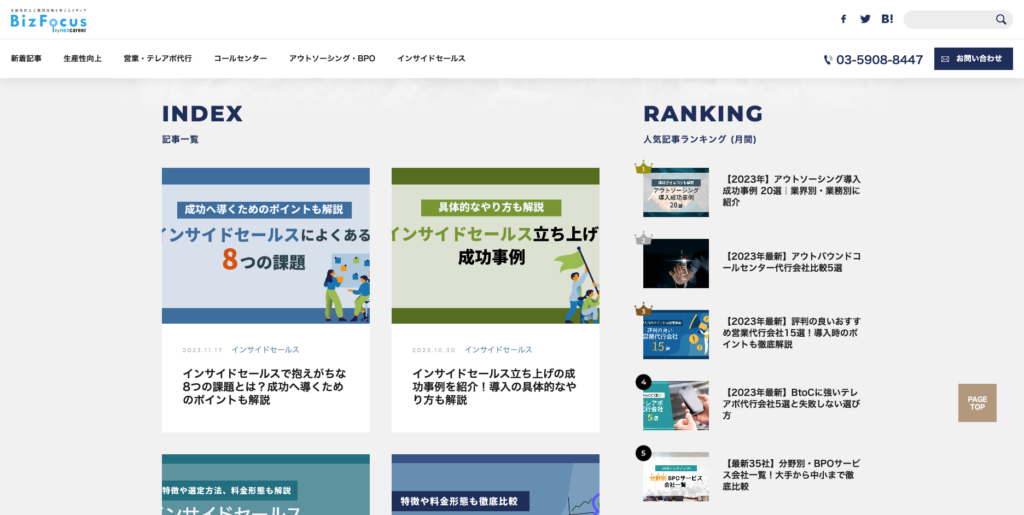 BizFocus様では「営業・テレアポ代行 コールセンター アウトソーシング・BPO インサイドセールス」など複数のカテゴリーに分けて発信していらっしゃいます。